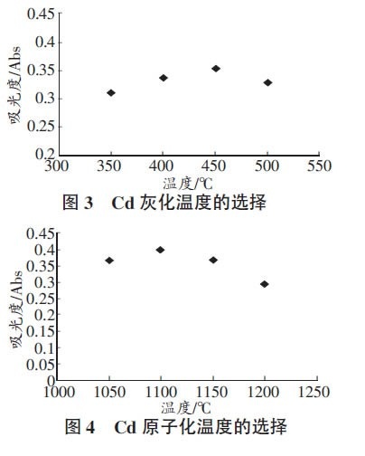 由圖3、圖4可知,Cd的最佳灰化溫度和原子 化溫度分別為450、1 100。