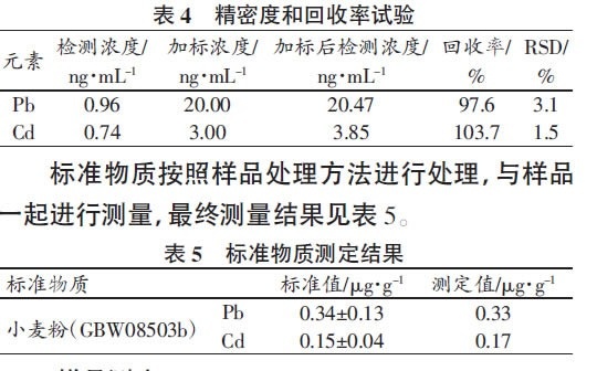 按照實(shí)驗(yàn)方法對(duì)1號(hào)油樣進(jìn)行精密度及回收率 實(shí)驗(yàn),對(duì)樣品連續(xù)測(cè)量11,計(jì)算2種元素的相對(duì)標(biāo) 準(zhǔn)偏差(RSD),同時(shí)對(duì)1號(hào)樣品進(jìn)行加標(biāo)回收實(shí)驗(yàn), 結(jié)果見(jiàn)表4。同時(shí)用相同的實(shí)驗(yàn)方法對(duì)國(guó)家標(biāo)準(zhǔn)物 質(zhì)GBW08503b小麥粉進(jìn)行測(cè)定,結(jié)果見(jiàn)表5。2種 元素的含量均符合標(biāo)準(zhǔn)值要求,說(shuō)明2種元素測(cè)定 方法準(zhǔn)確可靠。
