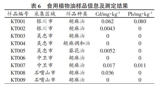分別精確稱取各地區(qū)樣品,按照1.2、1.3的樣品 處理方法及儀器工作條件測(cè)定樣品中鉛和鎘的含 量。樣品均采自寧夏地區(qū)的4個(gè)市、縣加工企業(yè),樣 品信息及檢測(cè)結(jié)果見(jiàn)表6。