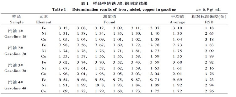 鐵,鎳,銅是汽油中的有害物質(zhì),車(chē)用汽油有 害物質(zhì)控制標(biāo)準(zhǔn)⑴中明確限制了一些金屬元素含 量。為了保證汽油質(zhì)量,保護(hù)環(huán)境和人體健康,準(zhǔn) 確測(cè)定汽油中鐵、鎳、銅含量有重要意義。