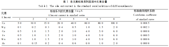 分別取碳酸鈣1.2479g、氧化鎂0.823g、硫酸亞鐵銨3.511g、鋅粒0.500g、銅片0.500g、氯化錳0.7912g,用5%HCl(體積百分含量,下同)溶解于500ml容量瓶中,配制成濃度為1000mg/L的儲備液。用5%HCl稀釋上述各儲備液,將其配制成100mg/L的標(biāo)準(zhǔn)溶液,然后再用5%HCl分別稀釋配制1~8系列標(biāo)準(zhǔn)溶液,各標(biāo)準(zhǔn)溶液濃度如表1所示。