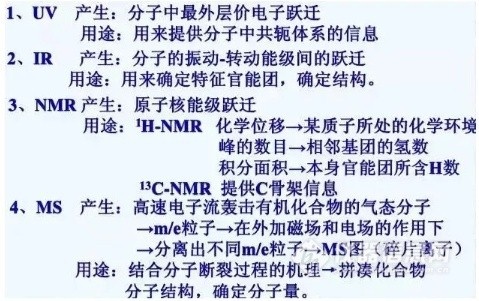 紫外-可見(jiàn)光譜(UltravioletandVisible Spectra UV)、紅外光譜(Infrared Spectra IR)、質(zhì)譜(Mass Spectrum MS)和核磁共振波譜(Nuclear Magnetic Resonance NMR)