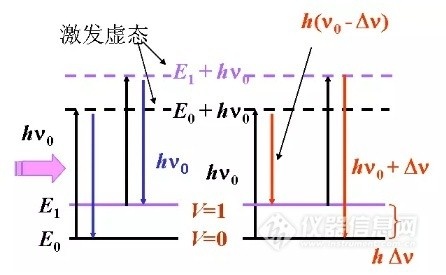 當(dāng)光線照射到分子并且和分子中的電子云及分子鍵結(jié)產(chǎn)生相互作用,就會發(fā)生拉曼效應(yīng)。對于自發(fā)拉曼效應(yīng),光子將分子從基態(tài)激發(fā)到一個虛擬的能量狀態(tài)。當(dāng)激發(fā)態(tài)的分子放出一個光子后并返回到一個不同于基態(tài)的旋轉(zhuǎn)或振動狀態(tài)。在基態(tài)與新狀態(tài)間的能量差會使得釋放光子的頻率與激發(fā)光線的波長不同。