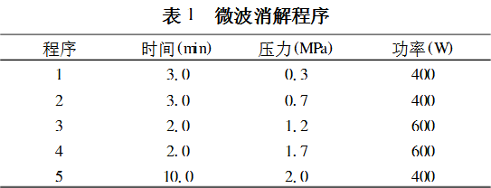1、土壤微波消解條件確定采用微波消解儀消解土壤,在210MPa下消解10min,如表1所示。