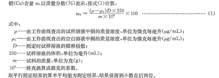 測定:吸取一定體積的試樣溶液于100ml容量瓶中,加入4ml鹽酸溶液(3.1.2.1)用水定容、混勻,在相等的條件下,測定吸光度值,在標準曲線上查出相應(yīng)銅的質(zhì)量濃度。