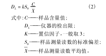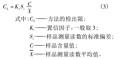 方法的檢出限是指一個(gè)給定的分析方法在特定條件下能以合理的置信水平檢出被測(cè)物的最小濃度,它是表征分析方法的最主要的參數(shù)之一。分析方法隨機(jī)誤差的大小不但與儀器噪聲有關(guān),而且決定了方法全過程所帶來的誤差總和,與樣品性質(zhì)、預(yù)處理過程都有關(guān)系。為了能反映分析方法在整個(gè)分析處理過程的誤差,可采用已知結(jié)果的標(biāo)準(zhǔn)物質(zhì)或樣品按照分析步驟進(jìn)行測(cè)量,通過分析12份已知結(jié)果的實(shí)際樣品來計(jì)算方法的檢出限,計(jì)算公式如下: