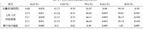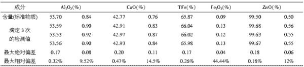 表1 滴定法測(cè)定陶瓷原料的化學(xué)成分由表1可知,滴定法測(cè)定低含量成分時(shí),相對(duì)偏差較大。如果低含量結(jié)果的精度要求高時(shí)不適用。