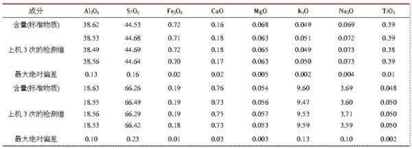表3 波長(zhǎng)色散X射線熒光法測(cè)定陶瓷原料化學(xué)成分(%)由表3可知,波長(zhǎng)色散X射線熒光測(cè)定成分時(shí),重復(fù)性較好。無(wú)論是主量元素,還是微量元素,其結(jié)果都比較滿意。能量色散X射線熒光測(cè)定成分時(shí),重復(fù)性也較好。但是所檢測(cè)的樣品范圍比較窄,如石英、鉀長(zhǎng)石、鈉長(zhǎng)石、高嶺土樣品能迅速測(cè)定,結(jié)果較滿意。混合樣品的檢測(cè)偏差比較大。