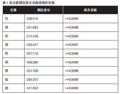 曲線2用以測(cè)定鉻、銅、鋰、錳、鍶,準(zhǔn)確移取5.00mL濃度為100?μg/mL的混合元素標(biāo)準(zhǔn)溶液于50?mL容量瓶中,用(1+99)硝酸溶液定容至刻線,制得標(biāo)準(zhǔn)儲(chǔ)備濃度為10?μg/mL。于6個(gè)100?mL容量瓶中,分別加入0.00、1.00、2.00、4.00、5.00?mL標(biāo)準(zhǔn)使用液,用(1+99)硝酸溶液定容至刻線,制得濃度分別為0.00、0.10、0.20、0.40、0.50 mg/L的標(biāo)準(zhǔn)溶液,以測(cè)定值繪制標(biāo)準(zhǔn)曲線。采用儀器響應(yīng)最佳波長(zhǎng)或次優(yōu)波長(zhǎng)進(jìn)行分析測(cè)定,各元素相關(guān)系數(shù)如表1所示。