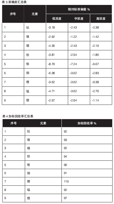 加標(biāo)回收率是另一個(gè)測(cè)試準(zhǔn)確度的指標(biāo)。在實(shí)際樣品中加入一定量的標(biāo)準(zhǔn)樣品,計(jì)算其加標(biāo)回收率。鈷、鎳、鎘、鋇、鉻、銅、鋰、錳、鍶9種元素加標(biāo)回收率范圍為90%~110%,如表4所示。說明分析過程的隨機(jī)誤差和系統(tǒng)誤差都較小,整個(gè)分析過程穩(wěn)定可靠。