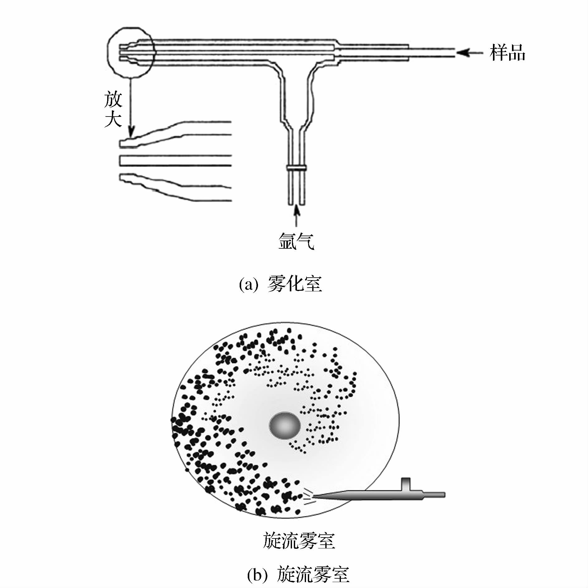 霧室的作用是對霧化器噴入的霧滴進(jìn)行選擇,去除電離效率低的大霧滴,選擇小顆粒(10μm)的霧滴進(jìn)入等離子體。經(jīng)過霧室的篩選,僅有1%~2%的樣品進(jìn)入到等離子體。由于每次分析都會有樣品殘留在霧室中,因此在分析結(jié)束后應(yīng)用硝酸(2%)和去離子水反復(fù)沖洗霧室,使用一段時間后(視樣品多少而定),若霧室附著肉眼可見的沉積物,將霧室卸下浸泡在硝酸(5%)48 h后進(jìn)行超聲清洗,再用去離子水清洗,烘干后即可使用。圖2為進(jìn)樣系統(tǒng)主要部件工作示意圖。