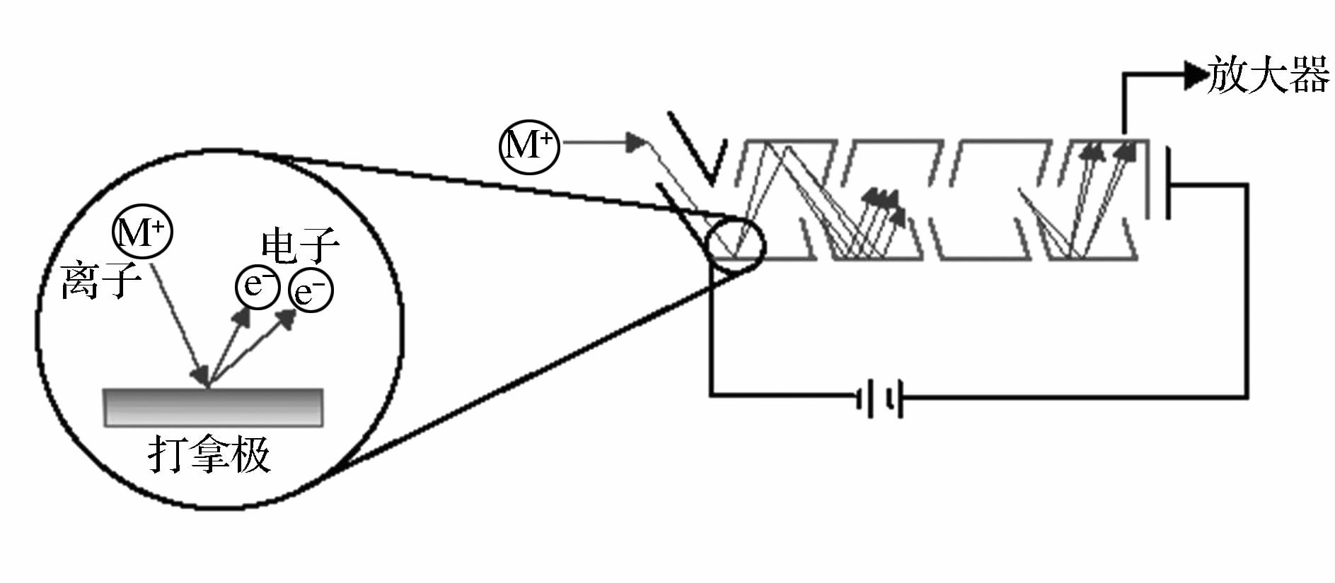 電感耦合等離子體質(zhì)譜儀(ICP-MS6880)采用雙階倍增檢測器,可以同時獲得模擬和脈沖信號,線性動態(tài)范圍較寬。圖7為檢測器工作原理示意圖??梢钥闯鰴z測器主要作用是放大檢測到的目標(biāo)離子信號,因此,檢測器使用一段時間之后會有“疲勞效應(yīng)”,導(dǎo)致靈敏度下降;另外,電子倍增器壽命取決于總的積累放電次數(shù),進(jìn)入高濃度樣品會加速檢測器內(nèi)表涂層消耗,縮短檢測器壽命。在分析環(huán)境樣品時,尤其是工業(yè)廢水和工業(yè)用地土壤,建議采用基體稀釋的辦法,避免長時間檢測高濃度信號。