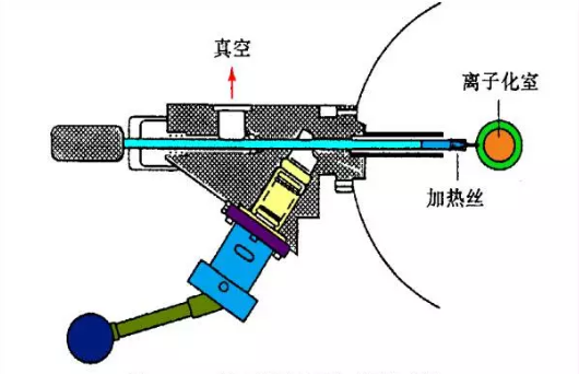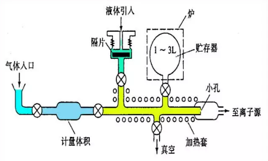 通過可拆卸式的試樣管將少量(10~100μg)固體和液體試樣引入試樣貯存器中,由于進樣系統(tǒng)的低壓強及貯存器的加熱裝置,使試樣保持氣態(tài)。實際上試樣最好在操作溫度下具有1.3—0.13Pa的蒸氣壓。由于進樣系統(tǒng)的壓強比離子源的壓強要大,樣品離子可以通過分子漏隙(通常是帶有一個小針孔的玻璃或金屬膜)以分子流的形式滲透過高真空的離子源中。