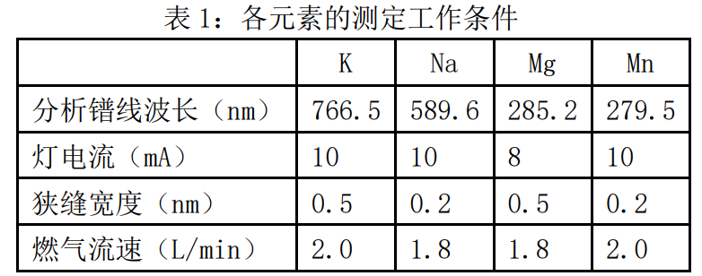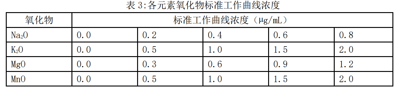 用KCl、NaCl、MgO、MnSO4·H2O分別配制成0.05mg/mL的各元素氧化物標(biāo)準(zhǔn)溶液待用,然后再經(jīng)過稀釋配制成所需要的濃度。以K2O為例,如取5mL0.05mg/mL的K2O標(biāo)準(zhǔn)溶液加入到500mL容量瓶中,加入30mLHCl,10mLCsCl溶液,定容搖勻。則此溶液K2O的濃度為0.5μg/mL,依此類推可根據(jù)需要配制成各種不同的氧化物濃度。(見表3)