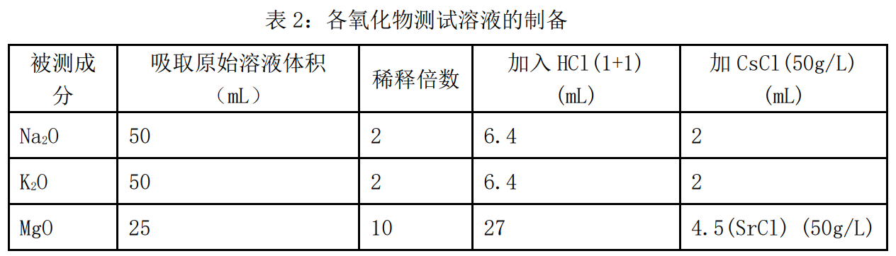 SrCl (50g/L)或CsCl (50g/L)。使測試溶液和標(biāo)準(zhǔn)曲線溶液中HCl濃度及SrCl 或CsCl的濃度保持一致。各氧化物的測試溶液制備方法如表2所示: