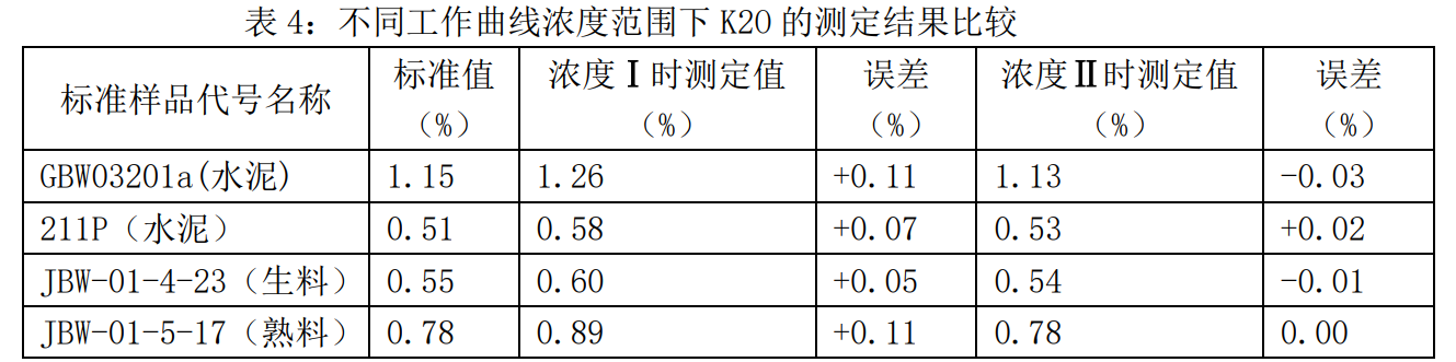 選擇最佳工作曲線濃度范圍的原則,其一是根據(jù)樣品中被測成分的大致含量,應(yīng)在滿足儀器分析條件的基礎(chǔ)上盡量減少稱樣量;其二是要使測量值盡量處在工作曲線中部范圍內(nèi)。下面是同一樣品不同稱樣量,用同樣的制備方法在不同的標(biāo)準(zhǔn)工作曲線濃度范圍下測定K2O時(shí)得出的結(jié)果比較。其中濃度Ⅰ為K2O濃度(0.0;1.0;2.0;3.0;4.0)μg/mL,稱樣量為0.2g;濃度Ⅱ為K2O濃度(0.0;0.5;1.0;1.5;2.0)μg/mL,稱樣量為0.1g。見表4
