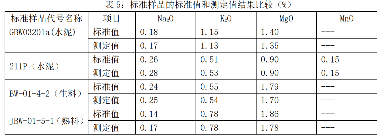 為了驗(yàn)證方法的準(zhǔn)確性,我們選擇了水泥、生料、熟料標(biāo)準(zhǔn)樣品進(jìn)行測試,得出的結(jié)果見表5