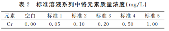 100μg/mL。放入100mL容量瓶中,用10%鹽酸稀釋至刻度,此標(biāo)準(zhǔn)溶液系列中鉻的質(zhì)量濃度見表2。
