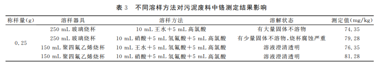 由表3可以看出:方法1溶解樣品后,有大量固體不溶物,因?yàn)闆]加氫氟酸,污泥廢料中的硅未被溶解;方法2溶解樣品后有少量固體不溶物,而且燒杯腐蝕嚴(yán)重;方法3,樣品溶解完全,但鉻元素測定結(jié)果偏低;方法4樣品溶解完全,鉻測定結(jié)果與分光光度法測定結(jié)果一致。所以選擇方法4作為溶解污泥廢料的方式。