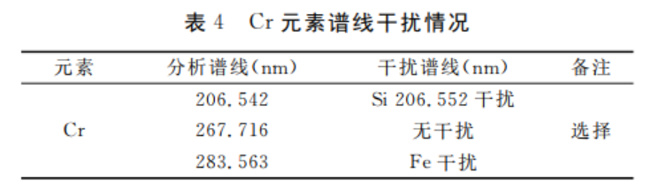 污泥廢料中其他元素為二氧化硅、碳和鐵。二氧化硅在溶解試樣時(shí),于聚四氟乙烯燒杯中加入了氫氟酸,形成四氟化硅揮發(fā)出去大部分的硅。在用ICP-AES進(jìn)行測量時(shí),Si206.552nm對Cr283.563nm產(chǎn)生光譜重疊干擾。放棄了206.542nm分析譜線的測量值,從而消除硅對鉻的測定干擾。