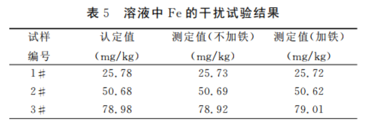 從表5結(jié)果可以看出:試液中含有的鐵量對鉻元素測量影響不大,直接用不加鐵的鉻標(biāo)準(zhǔn)溶液系列測定即可。鐵對鉻的測定無影響。