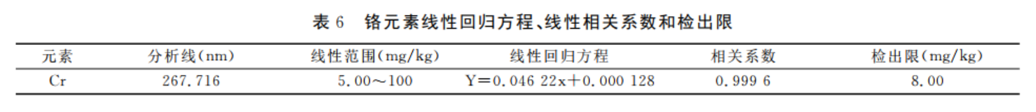 在儀器最佳工作條件下對標(biāo)準(zhǔn)溶液系列進(jìn)行測定,以鉻元素質(zhì)量濃度為橫坐標(biāo),發(fā)射強(qiáng)度為縱坐標(biāo),繪制標(biāo)準(zhǔn)曲線。在同樣條件下對空白溶液連續(xù)測定11次,計(jì)算標(biāo)準(zhǔn)偏差,以3倍的標(biāo)準(zhǔn)偏差計(jì)算方法的檢出限,結(jié)果見表6。