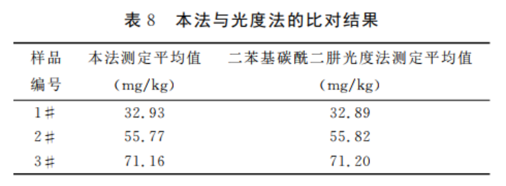 取三個(gè)樣品,按照實(shí)驗(yàn)方法測定污泥廢料中的鉻,又將這三個(gè)樣品用二苯基碳酰二肼光度法測定,將兩種方法測得的結(jié)果進(jìn)行對比,結(jié)果見表8。