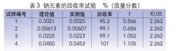 將有機標樣加到典型樣品中做加標回收試驗.并對理論值和測試結(jié)果進行線性回歸,以此方法考察各元素含量的測試準確性。限于篇幅,本文以鈉元素為例,數(shù)據(jù)見表3。