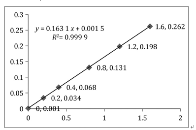 對(duì)空白溶液進(jìn)行11次測(cè)定,根據(jù)其3倍的標(biāo)準(zhǔn)偏差計(jì)算出該方法的檢出限,檢出限是0.014μg/mL。
