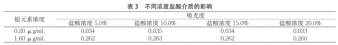 試驗(yàn)數(shù)據(jù)表明,當(dāng)鹽酸濃度為5%~20%時(shí),銀標(biāo)準(zhǔn)溶液的吸光度值基本不變,在這個(gè)酸度范圍內(nèi),其對(duì)銀的吸光度基本沒有影響。本試驗(yàn)選擇10%的鹽酸介質(zhì)。