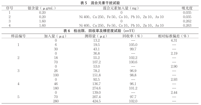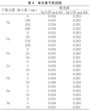 試驗(yàn)數(shù)據(jù)表明,于0.20μg/mL和1.60μg/mL的銀標(biāo)準(zhǔn)溶液中分別加入最大量各共存單元素,即相當(dāng)于樣品中的干擾元素含量滿足Ni80%、Cu50%、Fe10%、Co2%、Pb2%、Zn2%、As2%的條件時(shí),其對(duì)待測(cè)元素銀的測(cè)定基本無影響。