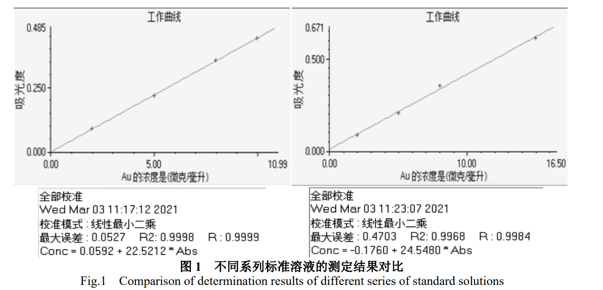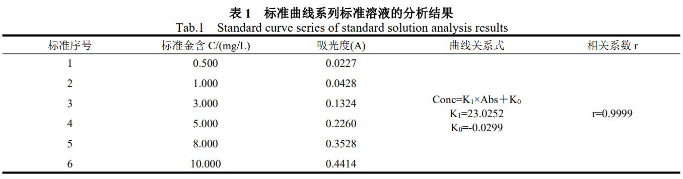 在測量標(biāo)準(zhǔn)溶液的同時測量試驗樣品和空白樣品,由扣除空 白后樣品的吸光度 Abs 樣,依標(biāo)準(zhǔn)曲線計算出樣品中的元素金含 量 Conc 樣。