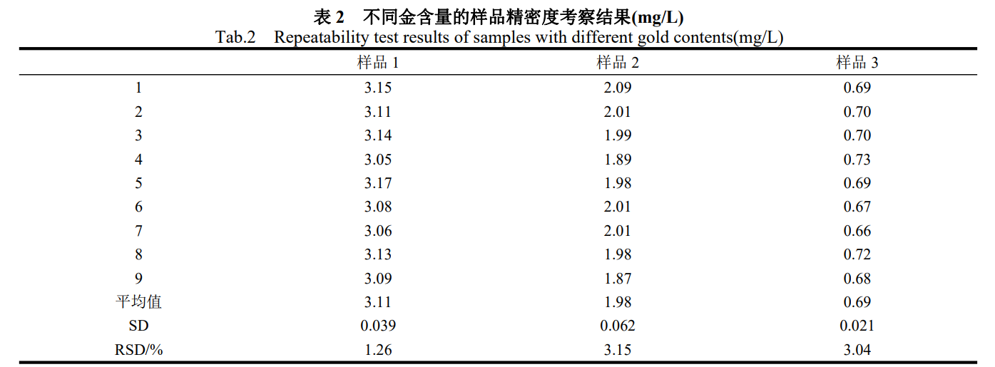 本方法具有準(zhǔn)確可靠、簡便快速、選擇性強、干擾少等優(yōu)點。 相比較電感耦合等離子體質(zhì)譜法測金成本低、效率高、維護簡單 的優(yōu)勢。該方法測定污酸廢水中金元素,其靈敏度、精密度和準(zhǔn) 確度均滿足要求。選擇本文提供的儀器參數(shù)和方法,有利于準(zhǔn)確、 精密的測定元素金。同時,為基體復(fù)雜而目標(biāo)元素含量低的測定 創(chuàng)造了條件。
