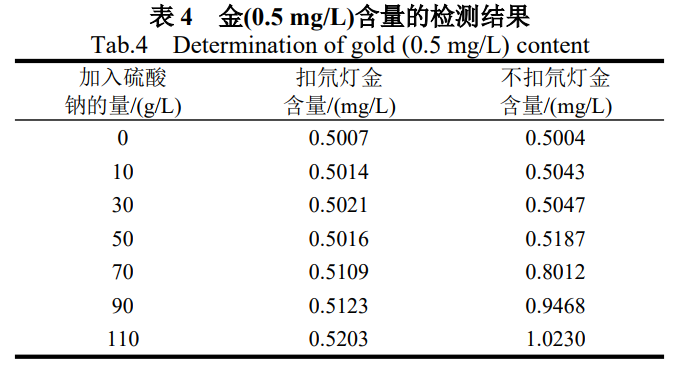 從表 4 可以看出:硫酸鈉含量低于 50 g/L 時,鹽份對檢測結(jié) 果沒有太大的影響??梢灾苯訙y定。硫酸鈉含量超過 50 g/L 時, 氘燈扣背景法能較好的消除背景干擾,使測定結(jié)果更接近實際值。