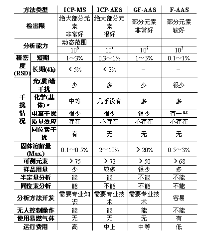 表4· ICP-MS、ICP-AES與AAS分析性能的比較