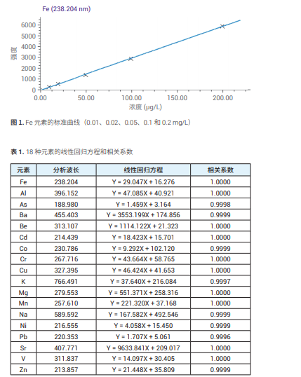 結果與討論 標準曲線 在石墨類負極材料中的雜質元素分析中,采用標準曲線法進行定 量分析。通過標準曲線結果發(fā)現,所考察的 18 種元素的線性相 關系數均大于 0.9995,這些元素的線性回歸方程和相關系數列于 表 1 中,其中 Fe 元素的標準曲線示例見圖 1。