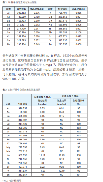 本文介紹了一種使用 (ICP-OES) 分析石墨類負極材料中多種雜質元素的方法,并對該方法進行了系統驗證。該方法的加標回收率在 90%–110% 之間,且 2.5 h 穩(wěn)定性實驗結果的相對標準偏差 (RSD) 小于 1.5%,證明該方 法具有良好的準確度和穩(wěn)定性,適用于對多品牌、多批次石墨類負極材料中的雜質元素進 行分析。