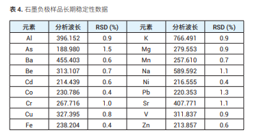 長期穩(wěn)定性 采用石墨類負極樣品 B 的加標溶液(加標濃度均為 0.025 mg/L) 來進行長期穩(wěn)定性實驗。樣品加標溶液連續(xù)測試 2.5 h,所測得 的雜質元素結果的相對標準偏差 (RSD) 如表 4 所示。從中可以看 出,所考察的 18 種雜質元素的測定結果 RSD 均小于 1.5%,表明 該方法在進行石墨類負極材料中雜質元素的分析時具有較好穩(wěn)定性和可靠性。